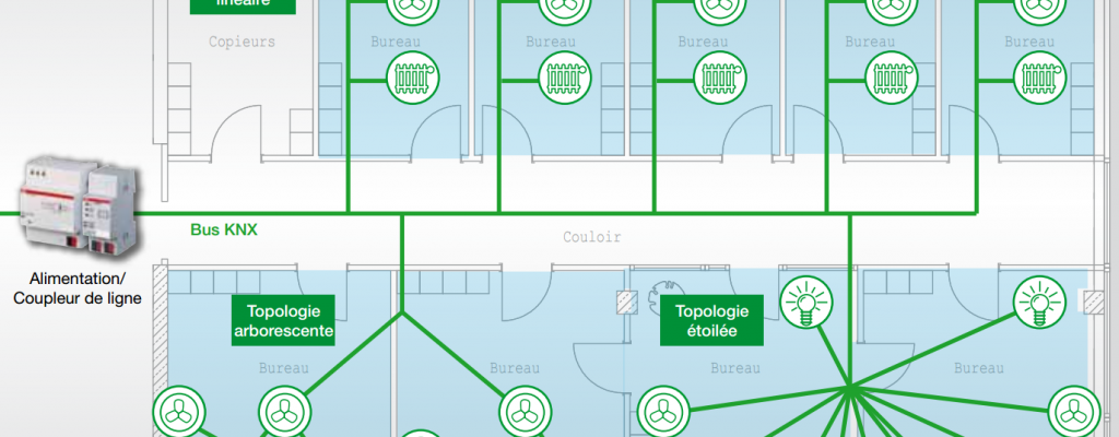 Les interrupteurs et les détecteurs de mouvement sont raccordés uniquement au bus KNX.